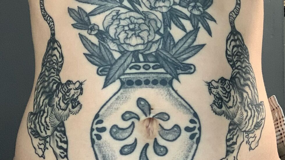 Sydney Pflaumer of Oleander Tattoo in Lincoln Square has done almost all of the younger Blanchard’s tattoos, including the tigers and a vase on her torso.
