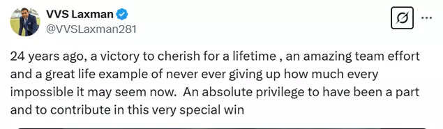 Reflecting on the historic triumph, Laxman wrote: "24 years ago, a victory to cherish for a lifetime, an amazing team effort and a great life example of never ever giving up, how much ever impossible it may seem now. An absolute privilege to have been a part and to contribute in this very special win."