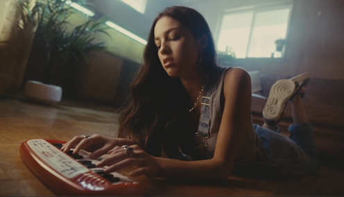 In another one of Rodrigo’s hit songs, “drivers license”, the male gaze imposed by the camera seems to have pedophilic tendencies. This is suggested by the marked presence of three symbols of childhood: the overalls Rodrigo wears, the capitalization error in the title of the song and the toy keyboard on which the young woman repeatedly plays a simple tune that accentuates its juvenile character.