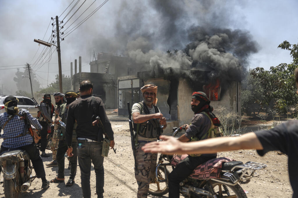 Bedouin fighters in front a burned shop in Mazraa village, during clashes between Bedouin and Druze, 18 July 2025. AP - Ghaith Alsayed