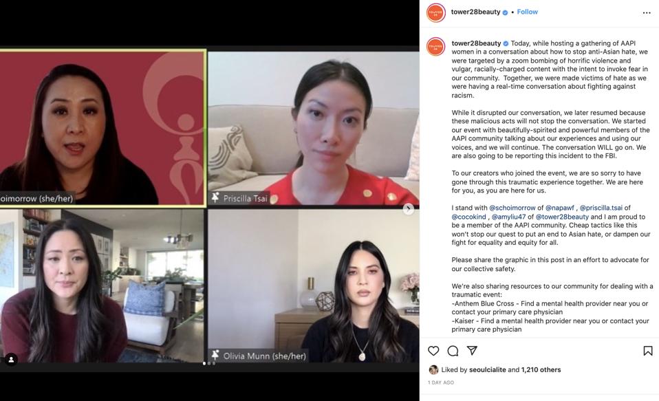 “During the event, Priscilla Tsai shared a statistic that 78% of AAPI women have been affected by anti-Asian racism at some point in their life,” Tower 28 founder Amy Liu tells Forbes. “Now, sadly 100% of the attendees at the event have experienced a racially fuelled attack and were made to feel unsafe.”