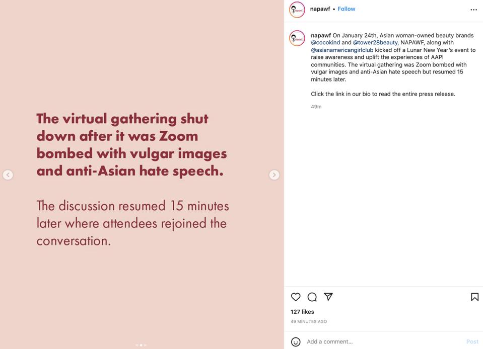 Sung Yeon Choimorrow, executive director of NAPAWF, also took to Instagram to share a statement on the NAPAWF account, “It comes as no surprise that Zoom bombing can target communities having conversations about racism and misogyny. Even in a space created by us and for us, the very things we were talking about happened while we talked about it.”
