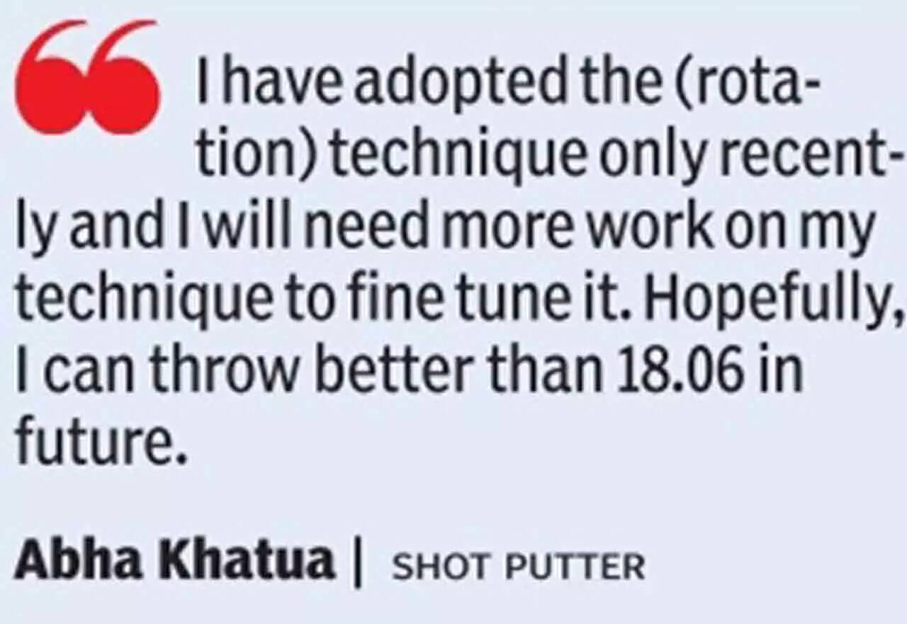 From the glide she moved to the rotation (like in discus) and the 28-year-old Khatua, a hawaldar with Mumbai Customs, moved from a 17 metre shot putter to 18.06 in the Asian Athletics Championships in Bangkok recently. She bagged the silver behind Chinese athlete while equalling Manpreet Kaur's national record.