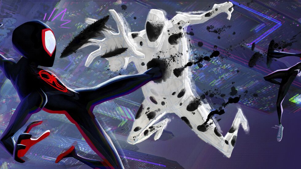 Ah, but despite that bloated running time, “Spider-Man: Across the Spider-Verse” really should be seen with a crowd, on the largest possible screen, with popcorn and jumbo-sized drink in hand. This is the very definition of a summer escapist blockbuster, featuring an awesome variety of visual designs and hues, from screen-popping CGI to rough-edged, hand-drawn frames to split screens to a few perfectly timed live-action cameos to some deliberately murky backgrounds, as if we’re looking at a 3-D movie without the glasses on. There are so many clever comic-book style title cards and quick-cut Easter Eggs, superfans watching this when it comes to home video will be pausing every 30 seconds and pointing at the screen like DiCaprio in “Once Upon a Time in Hollywood.”