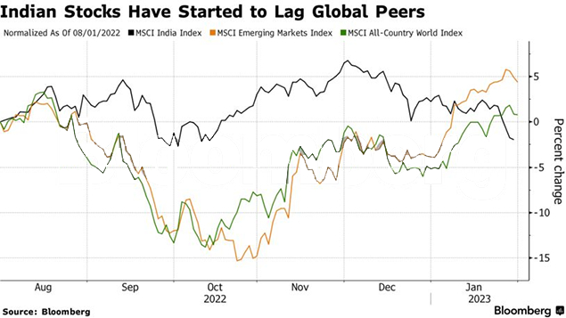 After outperforming global peers over the past two years, Indian stocks have fallen amid interest-rate hikes, reduced consumption and shifting investor preference as China reopens. Most recently sentiment has suffered from a short-seller campaign against Gautam Adani’s business empire.