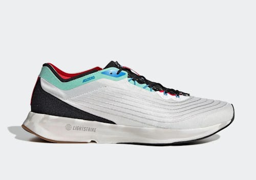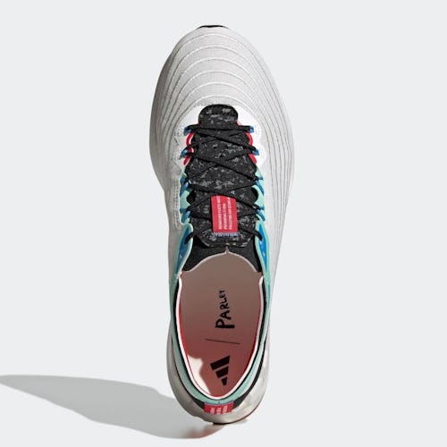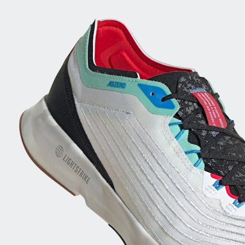 Light blue appears near the collar, along with the Adizero name, and red coats the inner sockliner and heel tag. The red tags, which are found on the heel and tongue, also feature some of the collab's messaging and stats, nodding to the Adidas x Parley mission. Underfoot, the sneaker gets fitted with a LIGHTSTRIKE cushion for a bouncy and supportive foundation. Black and brown panels round out the outsoles for some added grip as you hit the pavement.