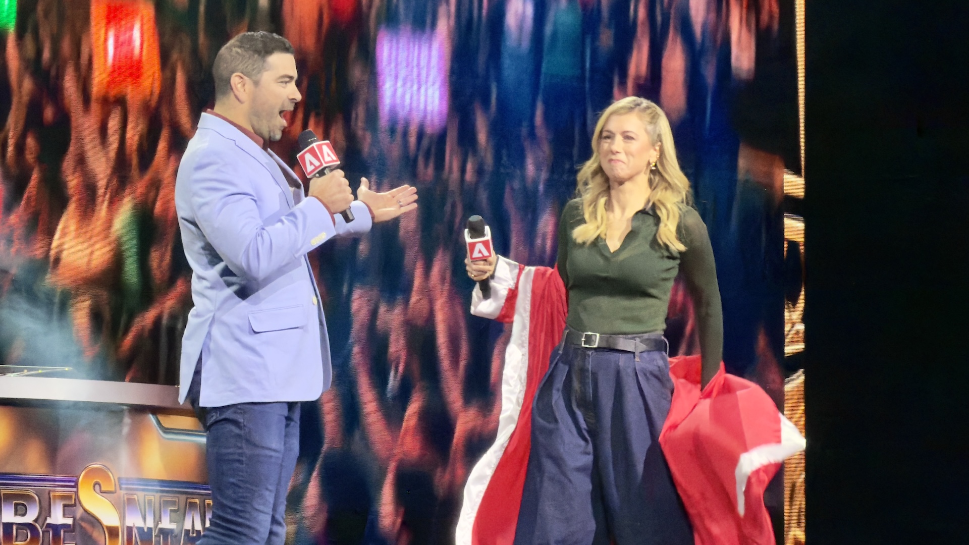 Welcoming the crowd at Sneaks is Adobe Evangelist Eric Matisoff and Comedian, Actress, Writer and Producer Iliza Shlesinger, who in true Sneaks fashion, are establishing a high-energy set on stage.