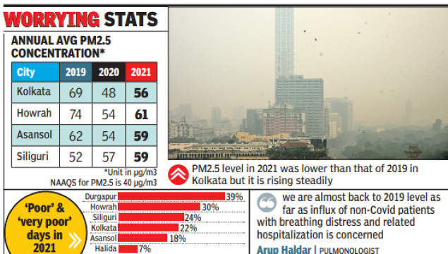 “The study corroborates our experiences at hospitals and clinics. There was a drastic drop in patients with breathing distress and related hospitalization in 2020 because of the clean air in 2020. But we are almost back to 2019 level as far as influx of non-Covid patients with breathing distress and related hospitalization is concerned,” said pulmonologist Arup Haldar.