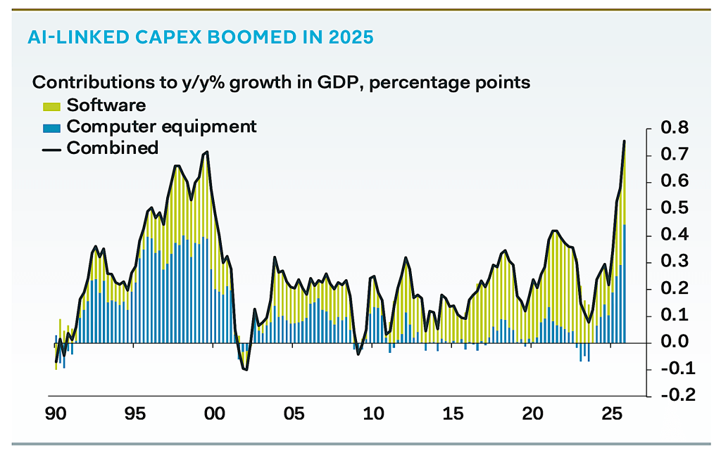 All told, “AI-linked capex and the wealth effect from gains in tech stocks probably accounted for a third of headline GDP growth towards the end of last year,” they said.