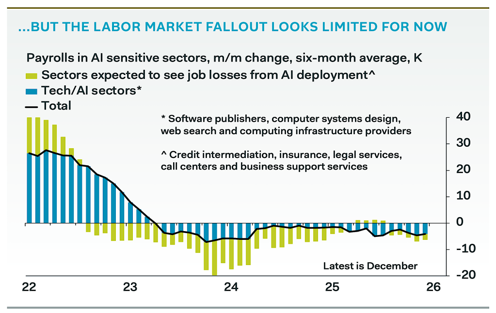 Pantheon believes that while AI has not yet shown up in headline productivity growth, there has been “an acceleration in productivity in those sectors where AI adoption currently is highest [like tech companies], offsetting a slowdown elsewhere. Productivity growth in the first group is meaningfully above its pre-pandemic trend,” the analysts said.