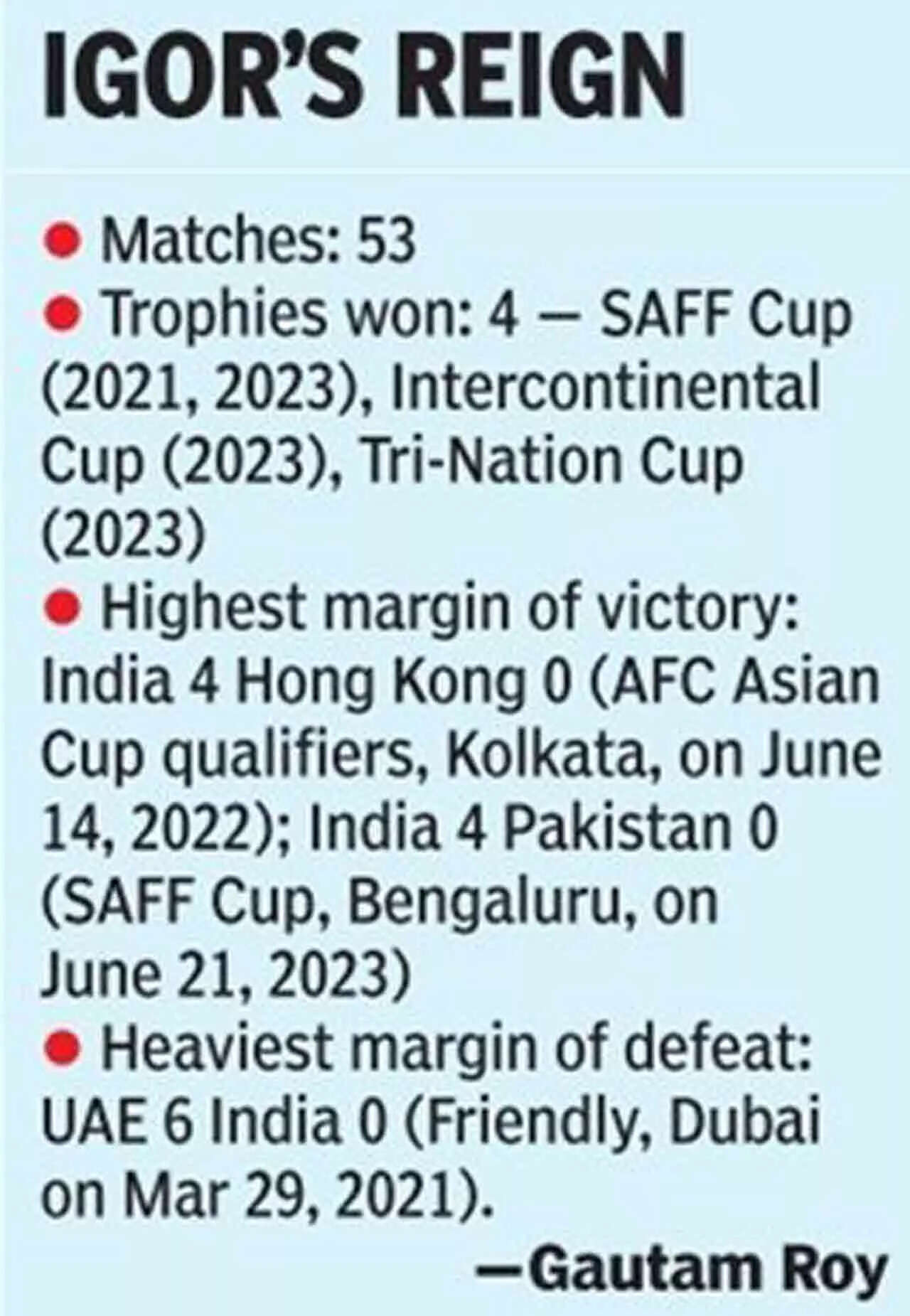 The Croatian presided over India's best year in terms of silverware in 2023 when the team won a record three trophies (Tri-Nation, Inter-Continental and SAFF Championship) broke into the top 100 of FIFA rankings (now 121) and recorded their best-ever run of clean sheets.