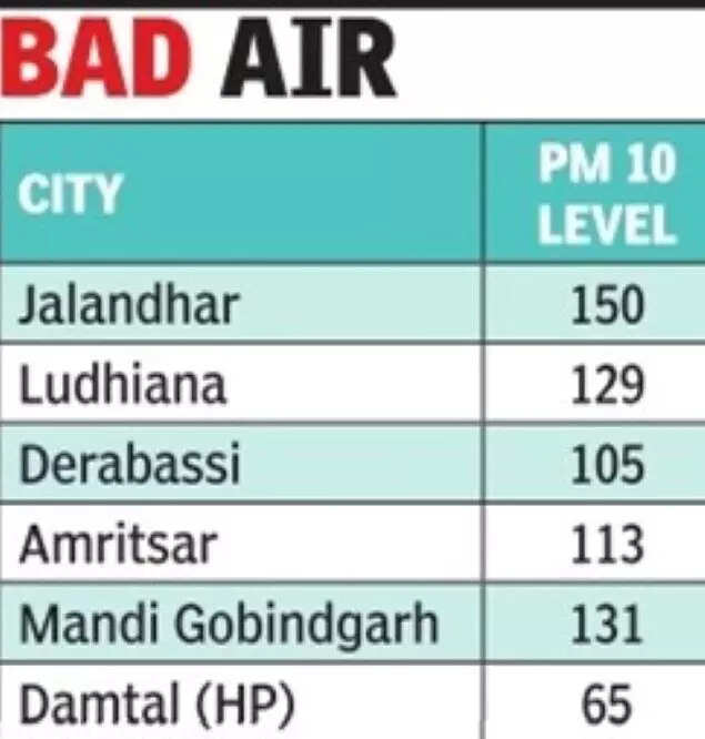 Among the 22 cities in the country that showed a jump in the concentration of PM10, the level went up from 121 to 150 in Jalandhar, 115 to 129 in the industrial town of Ludhiana and 100 to 105 in Derabassi, 109 to 113 in Amritsar and marginally went up from 130 to 131 in Mandi Gobindgarh. In Himachal, the air quality level fell in Damtal from 52 to 65. The cities where the situation showed improvement were Khanna where the AQI level fell from 113 to 101 , 68 to 66 in Dera Baba Nanak in Punjab, 133 to 123 in Baddi, 95 to 64 in Kala Amb and 98 to 78 in the industrial town of Paonta Sahib in Himachal.