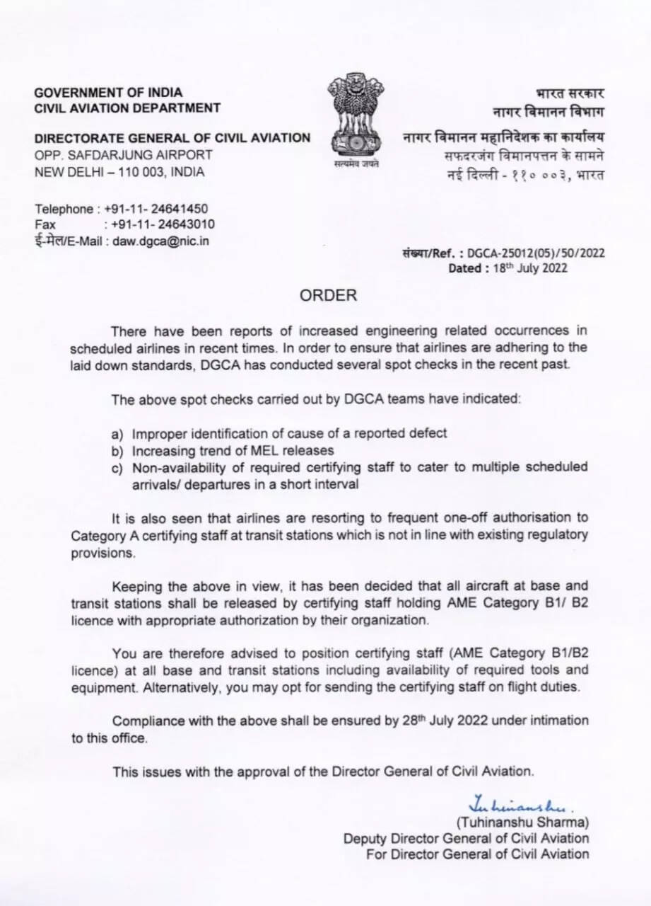 "You (airlines) are therefore advised to position certifying staff ( AME Category B1 / B2 licence ) at all base and transit stations including availability of required tools and equipment . Alternatively , you may opt for sending the certifying staff on flight duties. Compliance with the above shall be ensured by July 28, 2022 under intimation to this office," the order issued by deputy DG of the DGCA Tuhinanshu Sharma said.