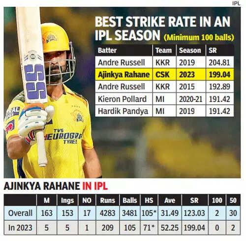 In five innings so far in this IPL, he has collected 209 runs at an average of 52.25, but what stands out is his strike-rate of 199.04, which is astonishing given the way Rahane has played most of his cricket so far.