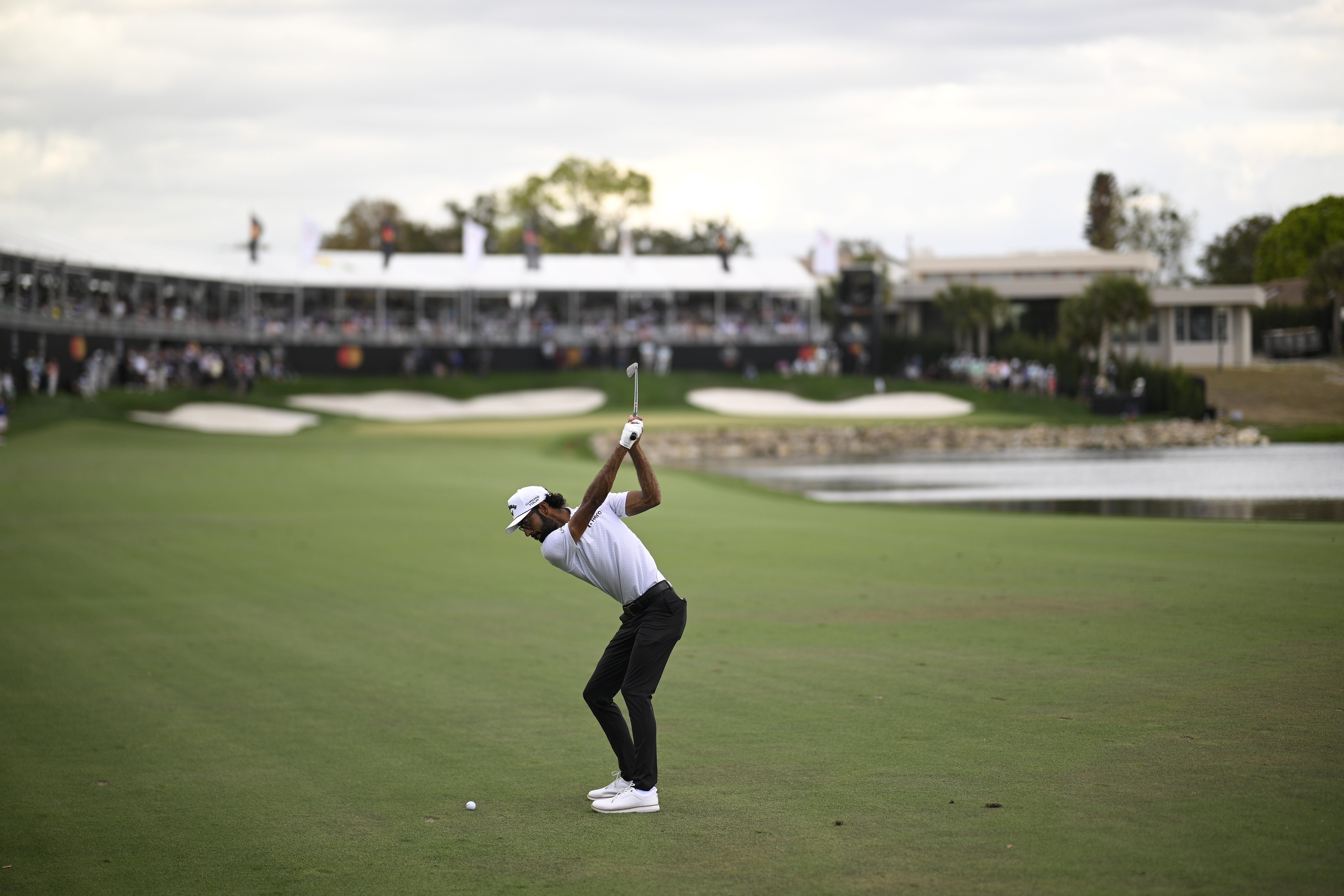 Striking his wedge, he pulls it right and it nearly goes into the water short of the green! Big break for Bhatia, who has a relatively simple chip coming up.