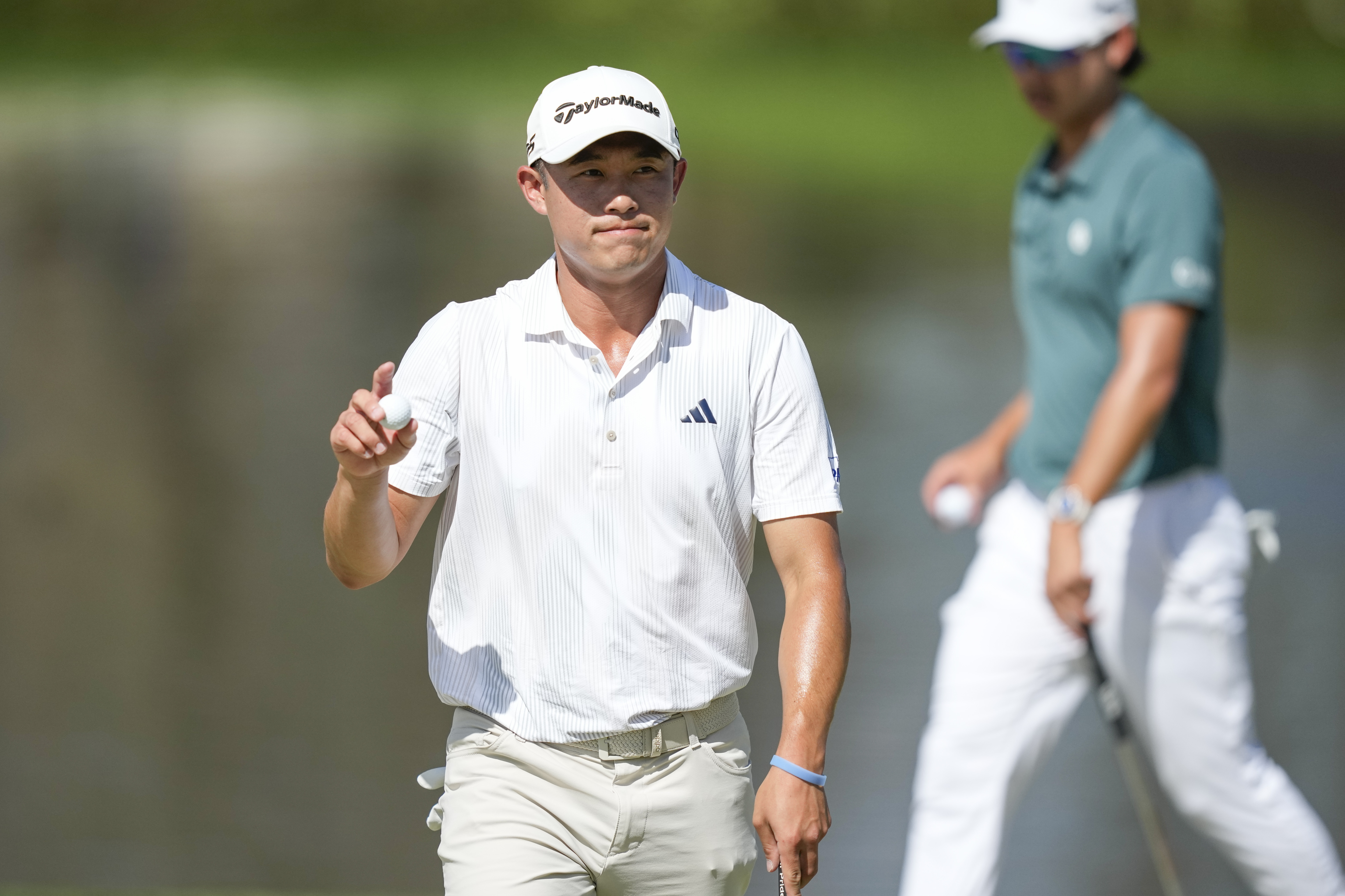 Finding the green in two on the par 5 16th, Cameron Young plays an excellent long-range putt to just three-foot.