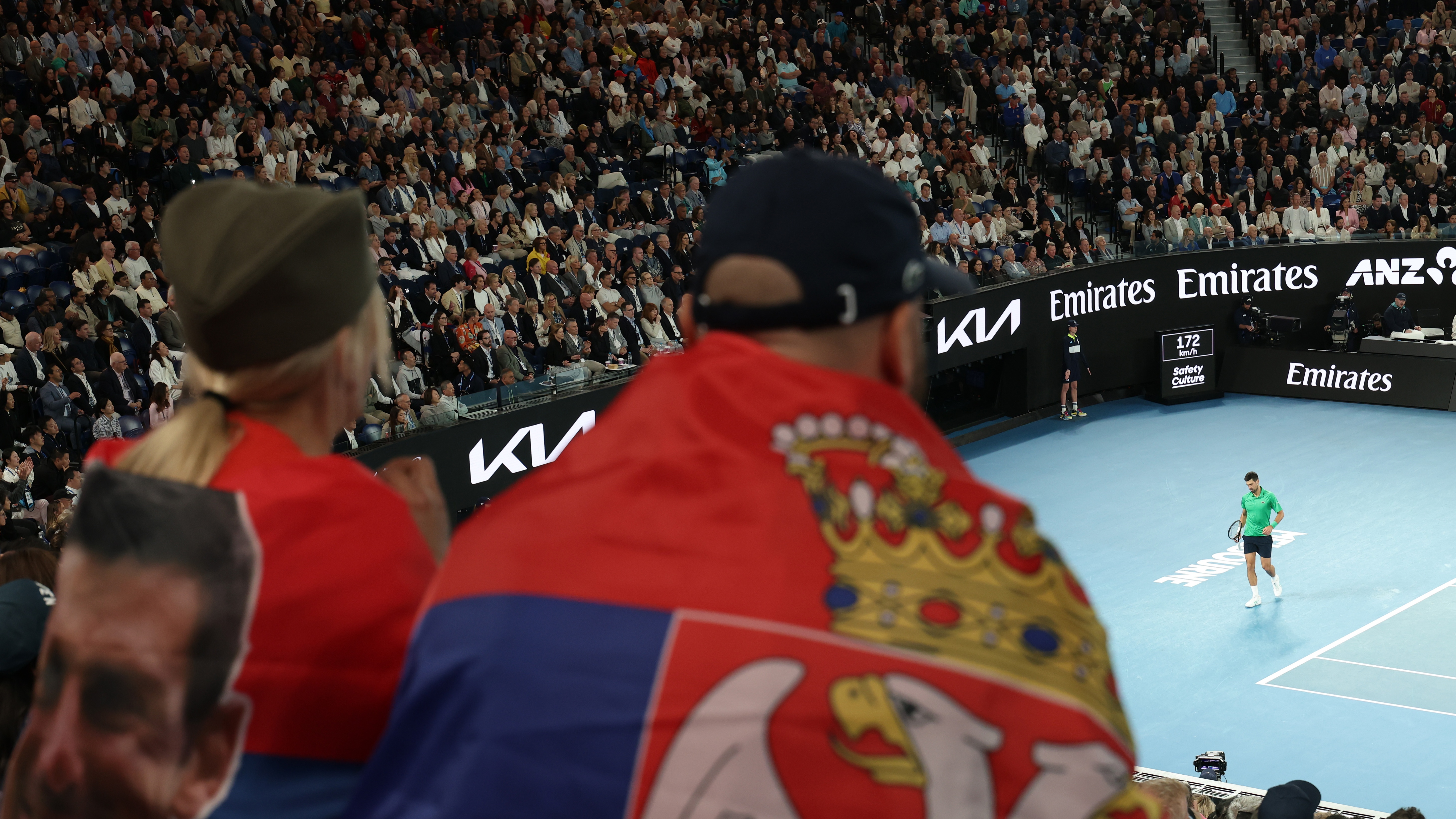 The crowd in Melbourne seem to be on the Serbs side for once and cheer him on to his next service game.