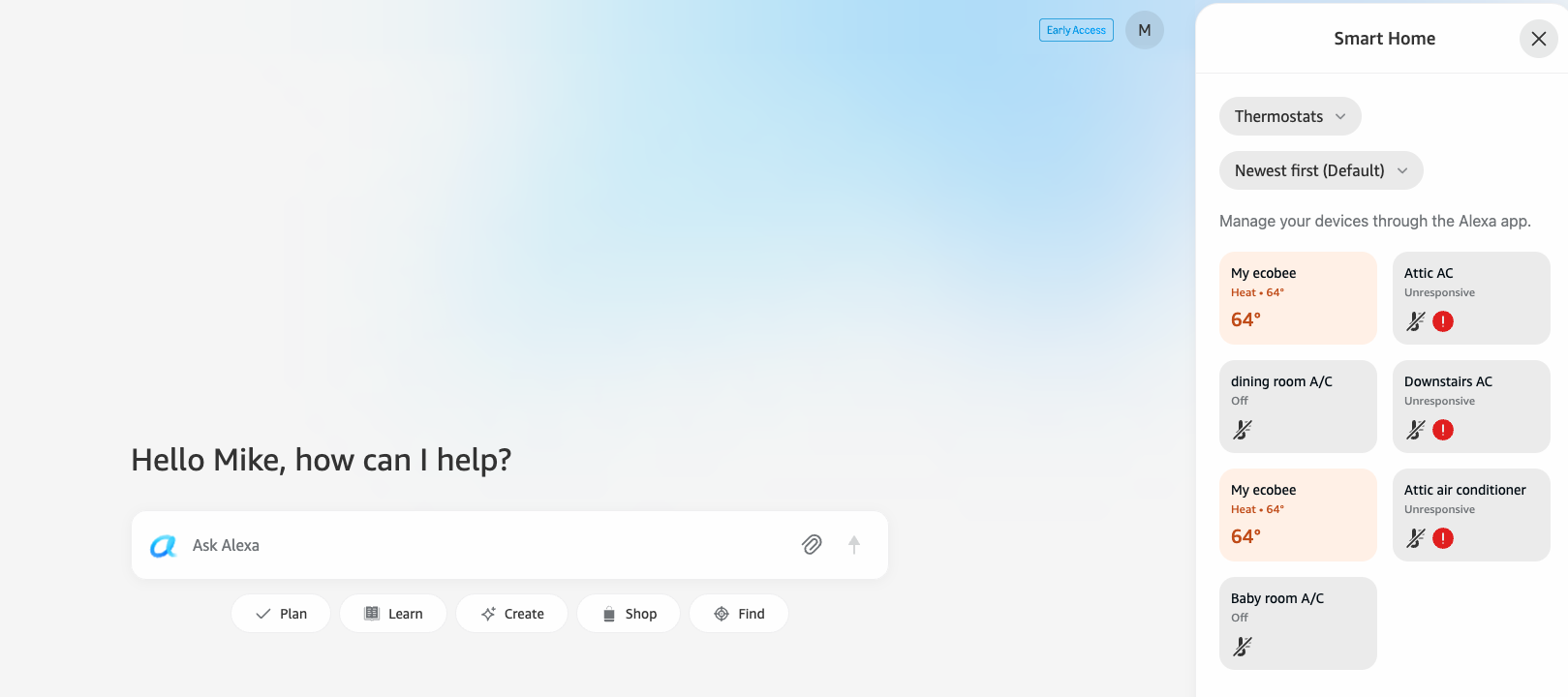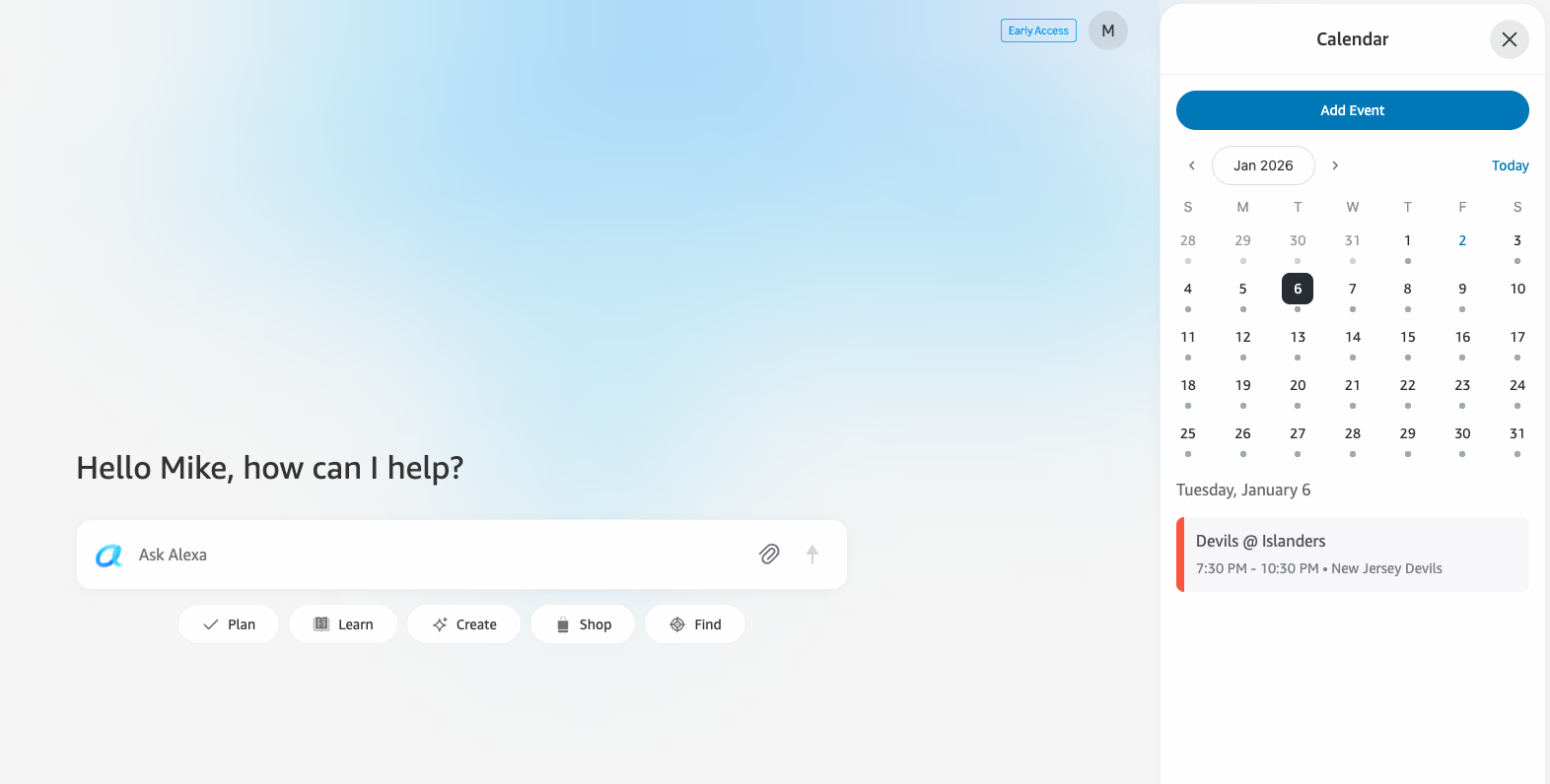 Below the bar are a few tabs to help provide some guidance on what you can ask Alexa+: Plan, Learn, Create, Shop, and Find. Mouse over any one of these, and a bubble with suggestions will appear.