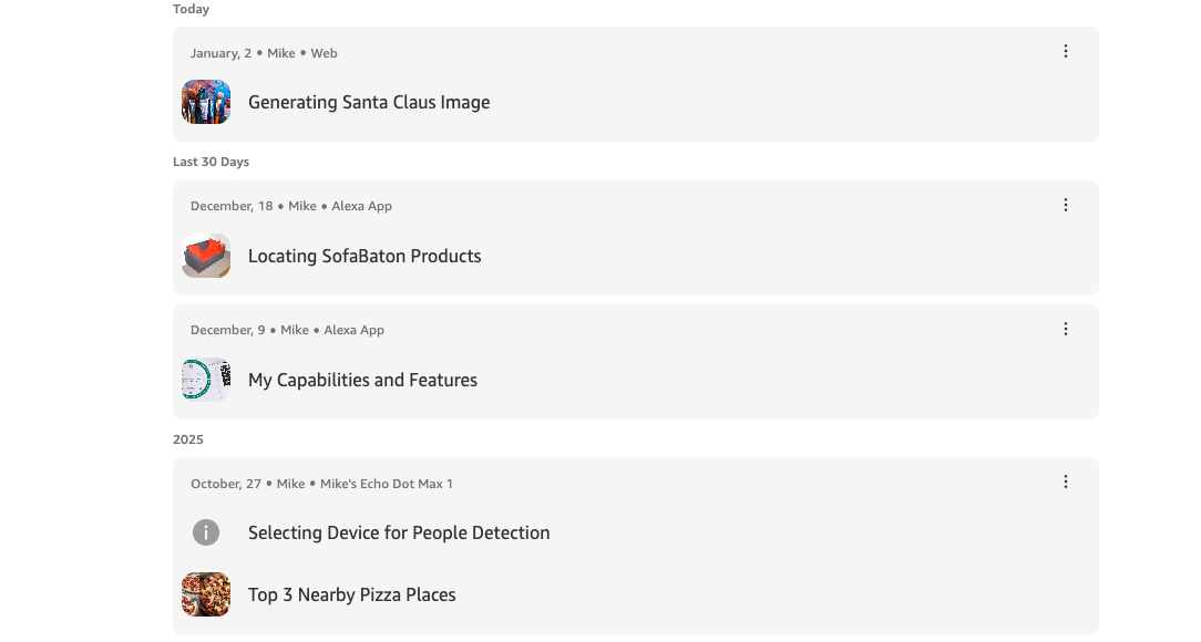 The second icon along the left lets you view your entire chat history with Alexa+; each interaction is listed, along with the device used to chat with Alexa+. Clicking on each item expands the chat to see it in its entirety. If you want to delete a particular chat, just click the three dots in the upper right of each entry.