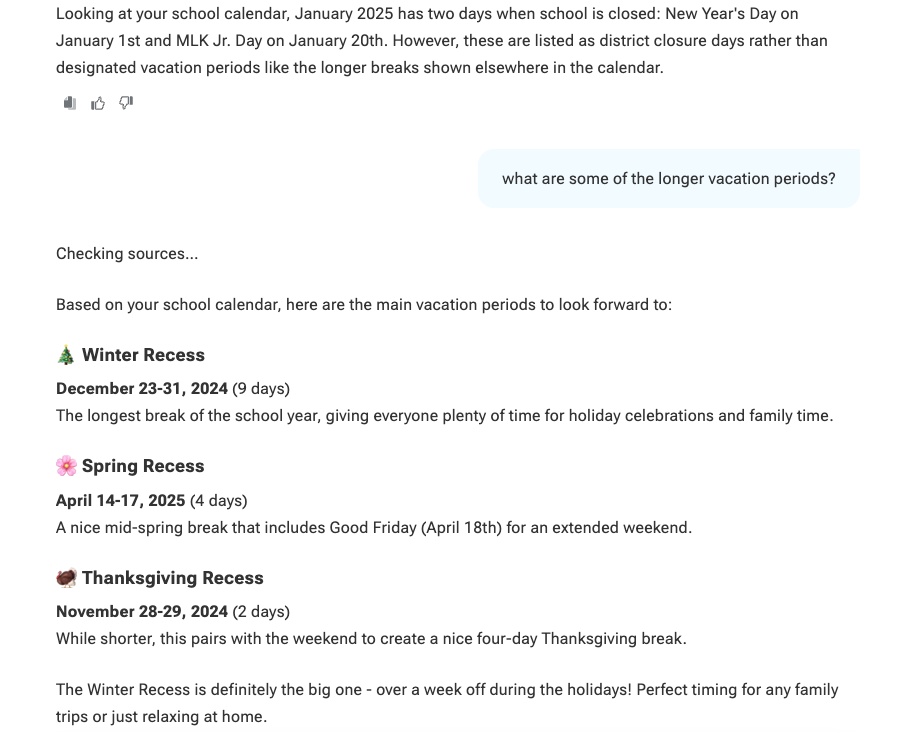 Alexa+ can also analyze all of the files that you've uploaded. For example, I uploaded my school district's calendar and asked how many vacation days there were in January. Alexa+ said that there were two vacation days, January 1 and MLK Day, but those were District Closure days, rather than vacation days.