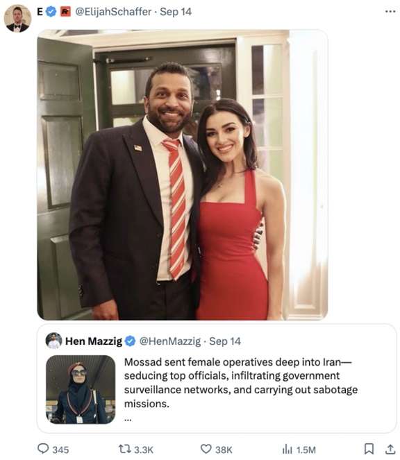 Plaintiff's claim is centered on an X-post drafted by the Defendant. The post at issue is caption-less but contains a photograph of Plaintiff alongside her significant other, Federal Bureau of Investigations (FBI) Director Kashyap "Kash" Patel. The post also "quotes" a distinct post, which in pertinent part, states that "Mossad sent female operatives deep into Iran-seducing top officials, infiltrating government surveillance networks, and carrying out sabotage missions."