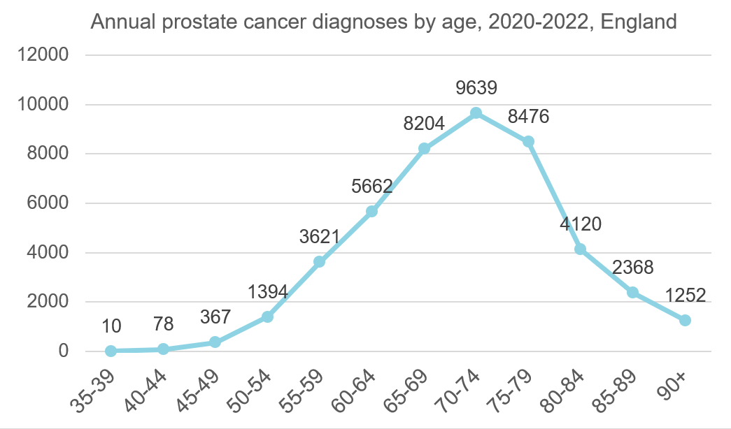“What we can see very clearly is there’s a steep upward trend up to the age of 74 and then it starts to drop down,” says Rylance. “So, each year you get older (up to the age of 74) it becomes more likely that you will be diagnosed with prostate cancer and beyond that it starts to come down again.
