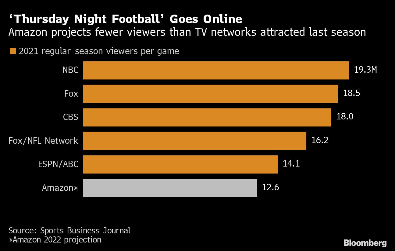 Amazon is guaranteeing advertisers it will reach more than 12 million viewers per game, down from about 16.4 million last year, the person said. Those projections were reported earlier by the Wall Street Journal. About 80 million households have watched Amazon Prime Video at least once in the past year, according to the company, about the same number who subscribe to a pay-TV service.