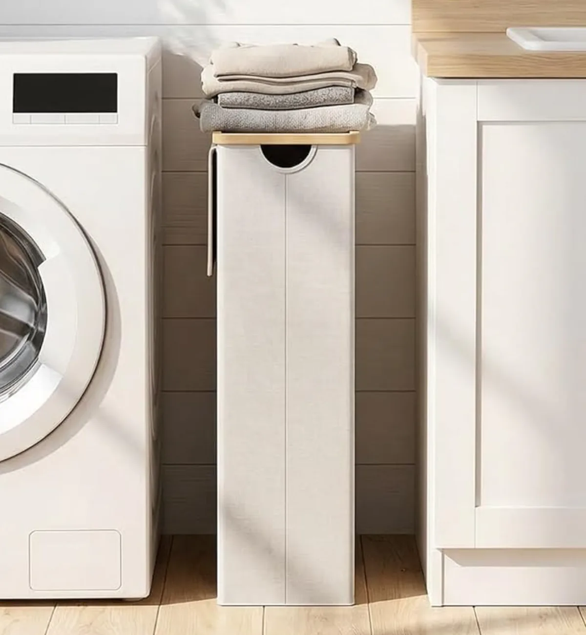 A slim laundry basket with a genius removable liner bag