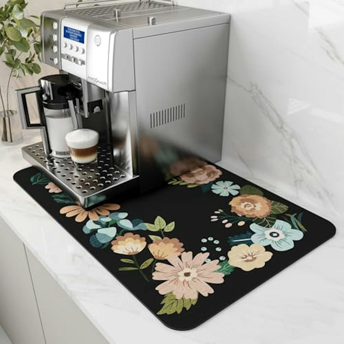 AMOAMI Coffee Mat Hide Stain Rubber Backed Absorbent Dish Drying Mat for Kitchen Counter - Bar Accessories Fit Under Coffee Maker, Espresso Machine, Dish Rack - Floral Black 12x19