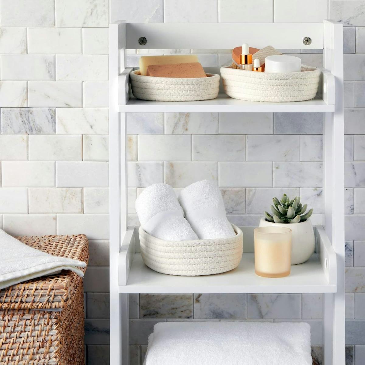 Gather everything from cosmetics to toys to washcloths together into decorative storage with these cotton rope baskets that fit on a shelf and hide clutter beautifully. They can be pressed into service as display baskets or even Easter baskets, too. This is a set of three.