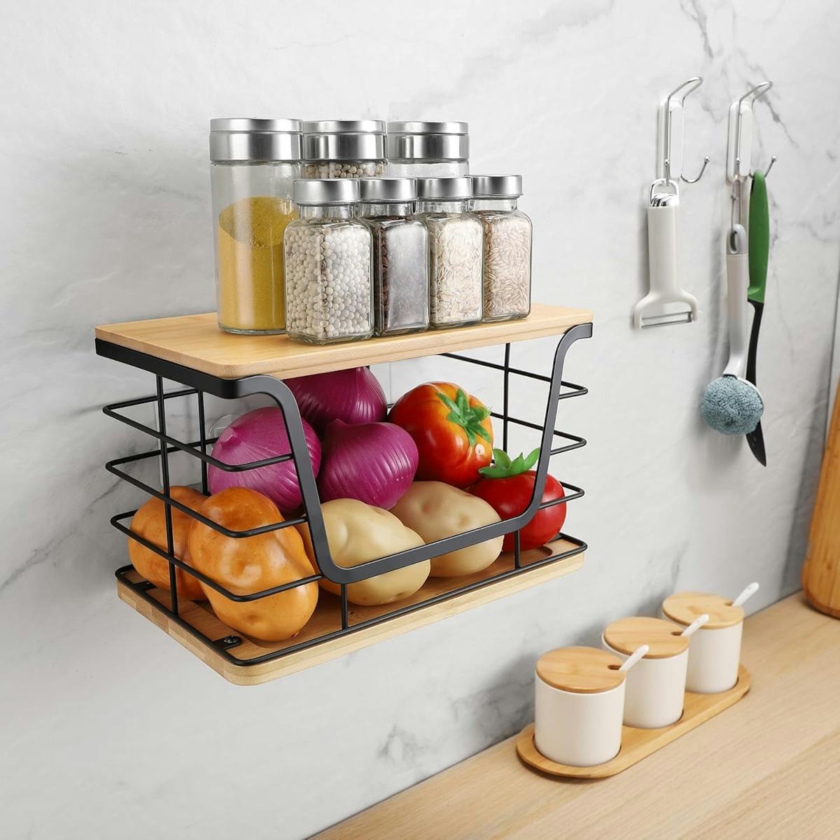 Keep the counter clutter to a minimum without hiding your fruits and vegetables in a cupboard by mounting this large wire basket to the wall. It holds the produce you like to keep out — or a roll for trash bags — in the basket below and creates a shelf on top. Or buy several and stack them. It comes in several colors.