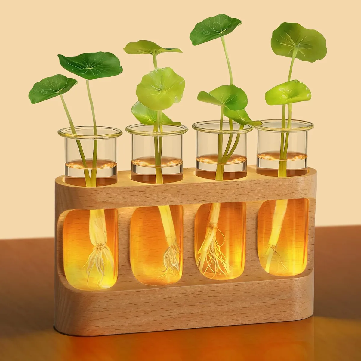 You could propagate your plants in random jars, but having a dedicated propagation station can make it easier to monitor growth. This one comes with a wooden base that has built-in LED lights so you can get a good look at the roots as they develop, and it comes with four glass test tube-style containers.