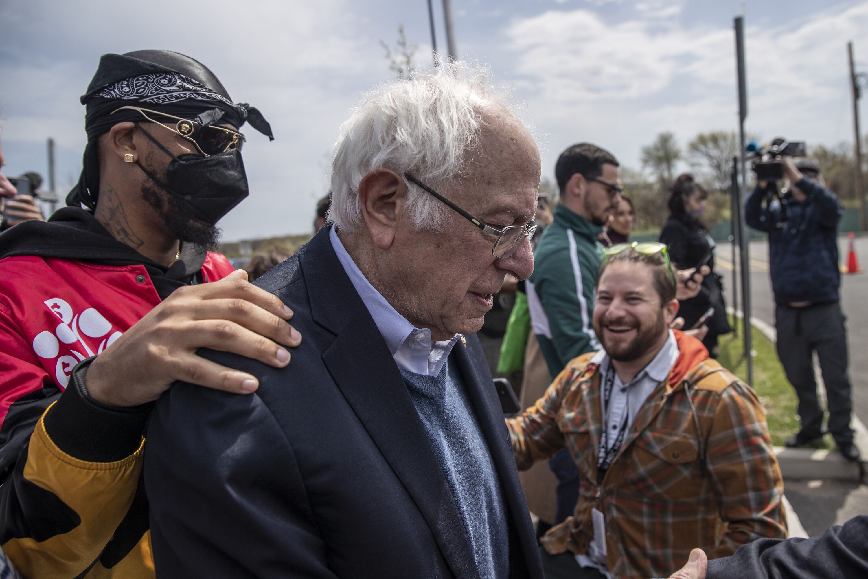 Senator Bernie Sanders, an Independent from Vermont, center, is escorted by Christian Smalls, founder of the Amazon Labor Union (ALU), left, after speaking at an ALU rally in the Staten Island borough of New York, U.S., on Sunday, April 24, 2022. Sanders visited Staten Island to meet with workers who this month successfully organized the first union in the country at an Amazon facility and workers at a separate facility who will be voting next week on whether to join a union. (Bloomberg)