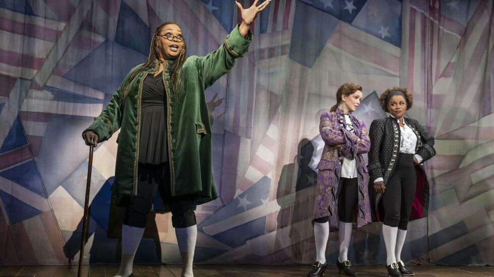 Even when the directors clearly want to add that sensibility, they stumble. For example, the addition of a silent enslaved person (Jill Marie Vallery) to serve Thomas Jefferson (Nancy Anderson) — supposed to be Sally Hemings’ brother Robert — feels too fleeting, too much like a footnote. And during the song “The Egg” — America is being born, get it? — the use of projected protest scenes from other eras comes across as medicinal virtue-signaling.