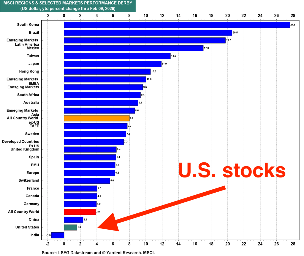 Analyst Ed Yardeni of Yardeni Research yesterday sent his clients a brutal chart showing the performance of U.S. stocks compared with foreign stock markets globally. You can see the U.S. right at the bottom there, besting only India.