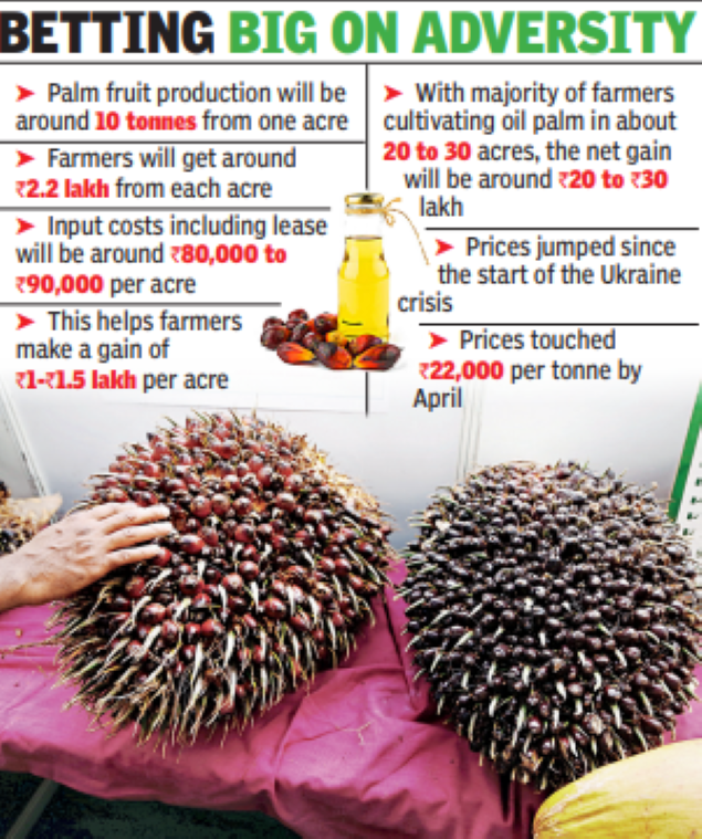 AMARAVATI: The Ukraine war is helping oil palm farmers in the state. Palm fruit now costs ₹22,000 per tonne from the previous ₹10,000 per tonne. Edible oil prices continue to soar in open market due to shortage.