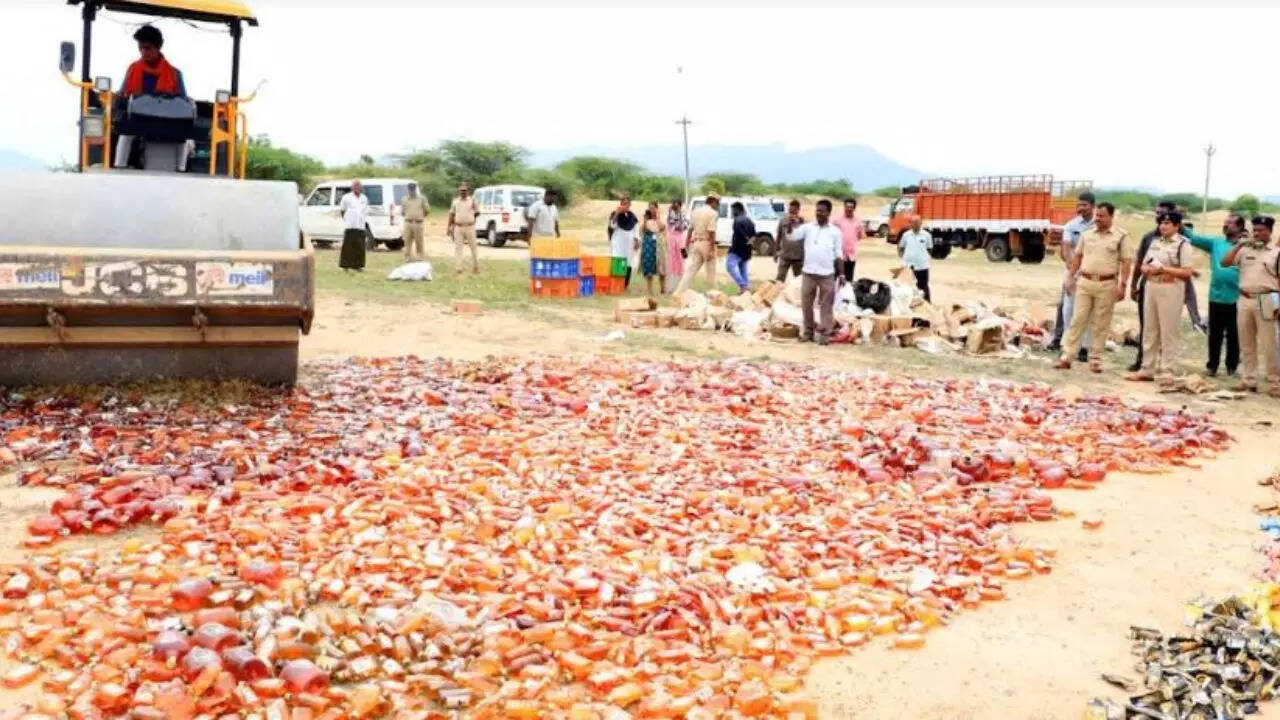 Tirupati SP P Parameswar Reddy personally monitored the process of destruction of seized liquor bottles near Tandlam at Gajulamandyam near Tirupati on Tuesday.
