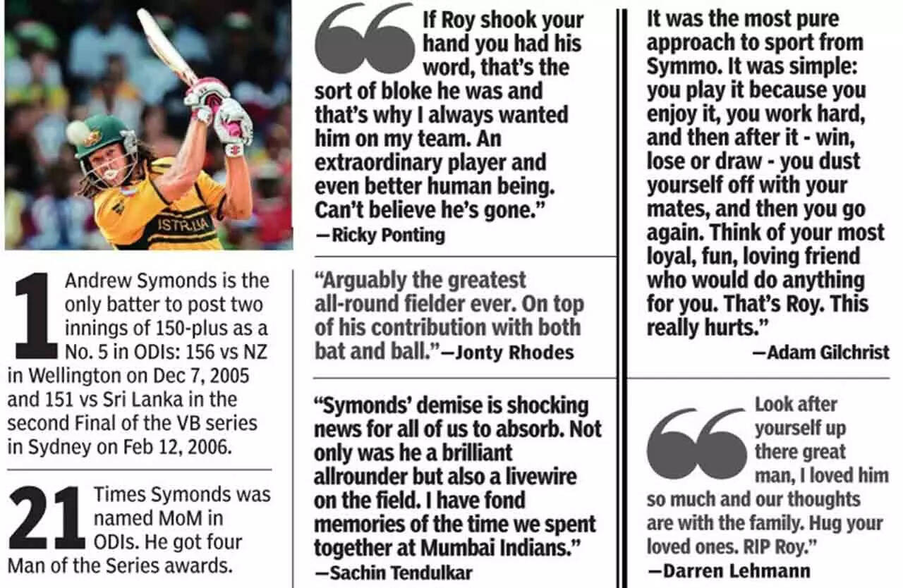 Two moments of breathtaking brilliance in the field are available on YouTube to define what Andrew Symonds was to that ridiculously talented Australian cricket team in the 2000s. The first is from an ODI in Melbourne vs West Indies in 2001. His victim was Laurie Williams, who tragically also died in a car crash, like Symonds did in Townsville, Queensland late on Saturday. Williams died in Jamaica in 2002, aged 33. Symonds was 46.
