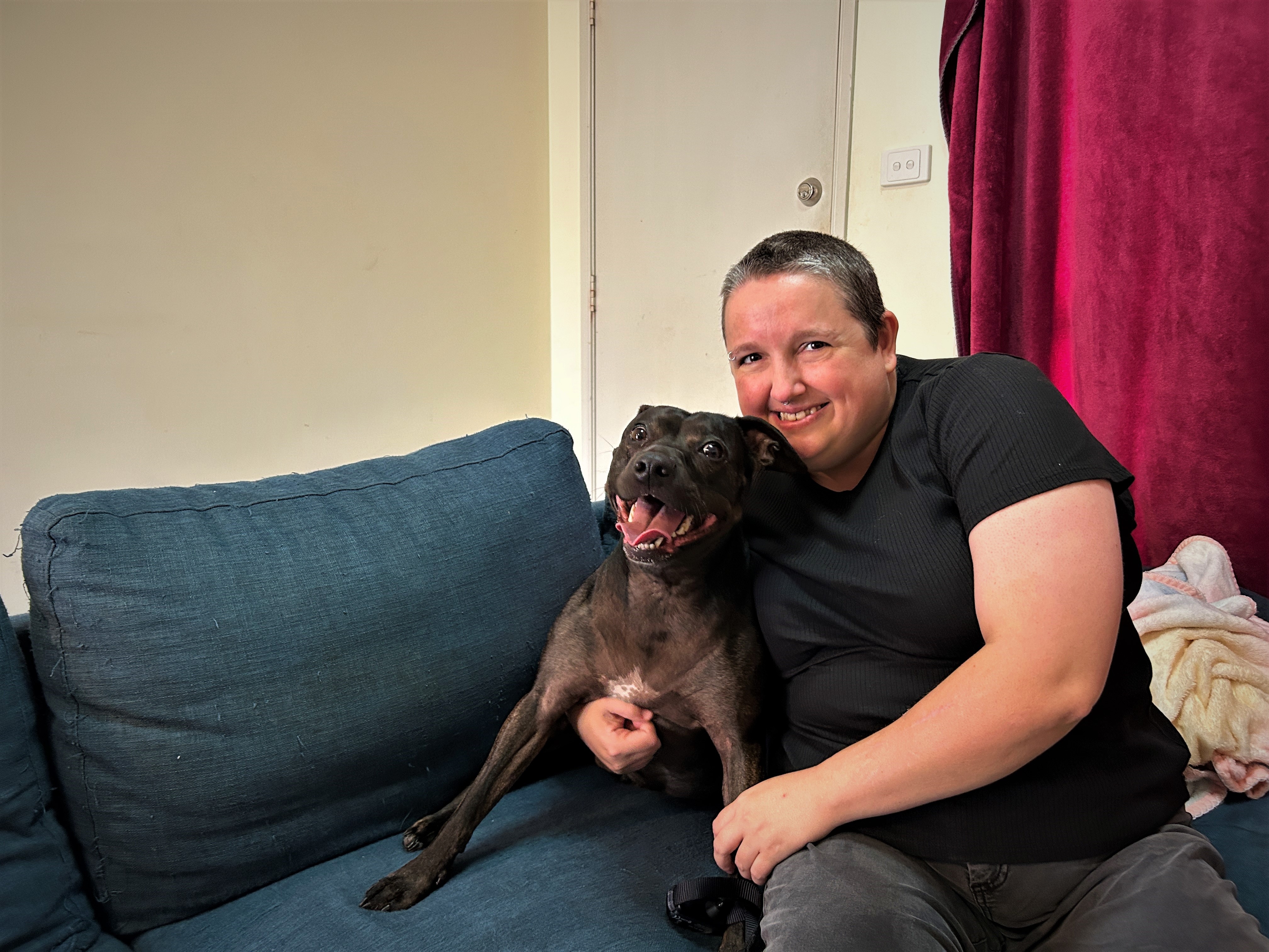 Unable to secure a home, Cynthia and her staffy-cross Storm have been staying at a friend's place.
