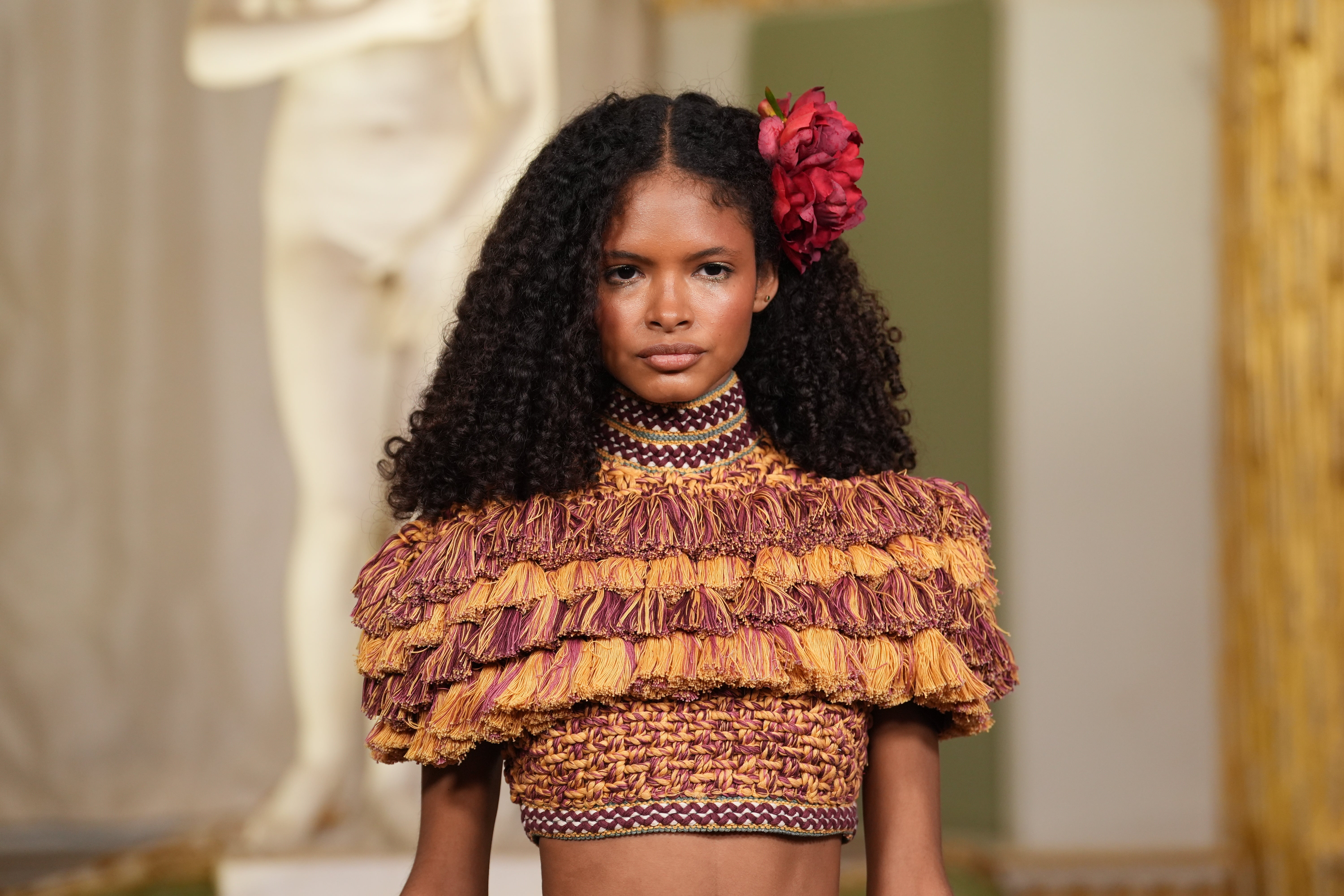 Fringe and tassels added movement, with one look in particular combining a high-neck woven dress with swaying orange fringing that brushed across the bodice, reinforcing the brand’s bohemian tone.