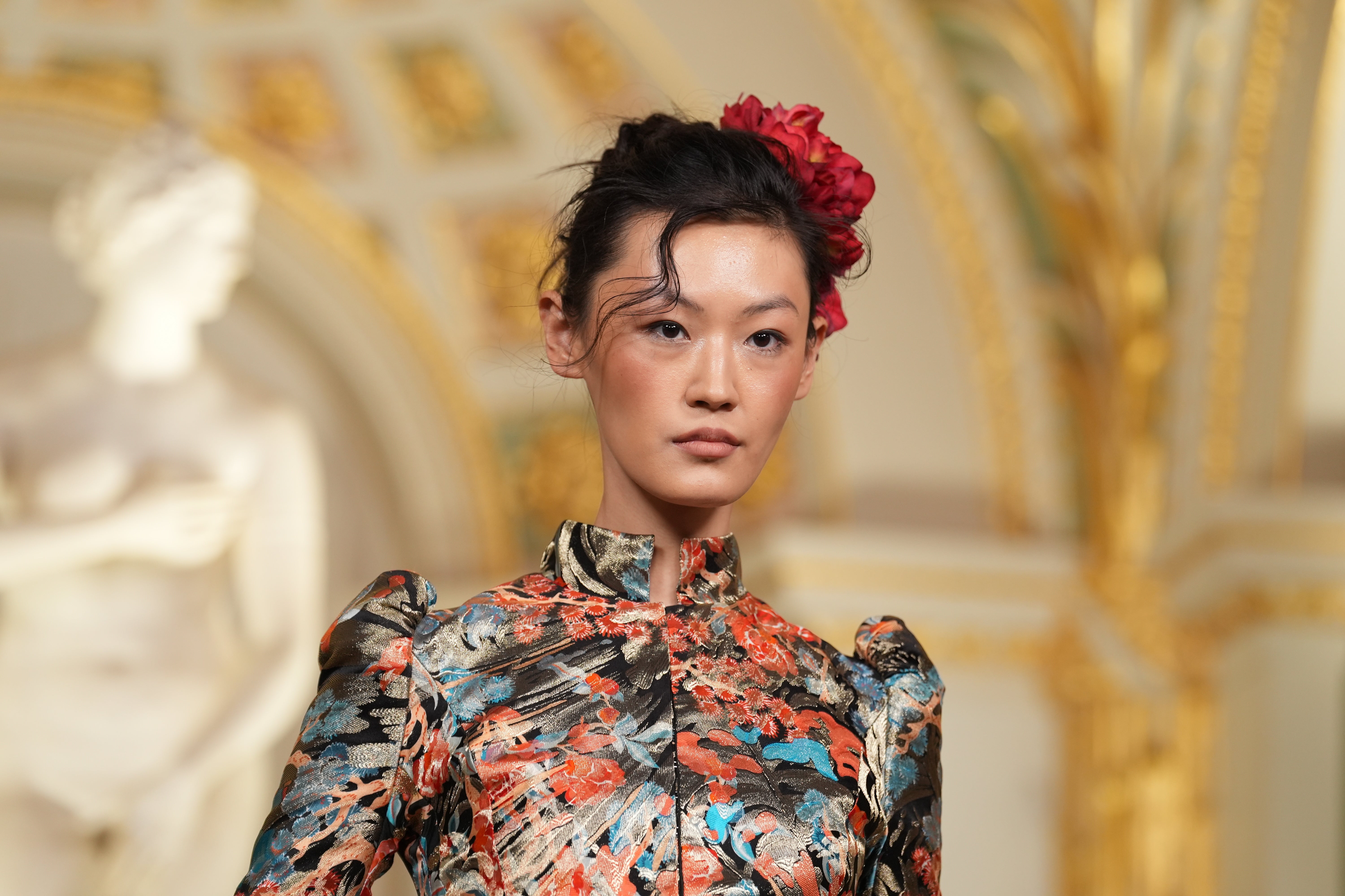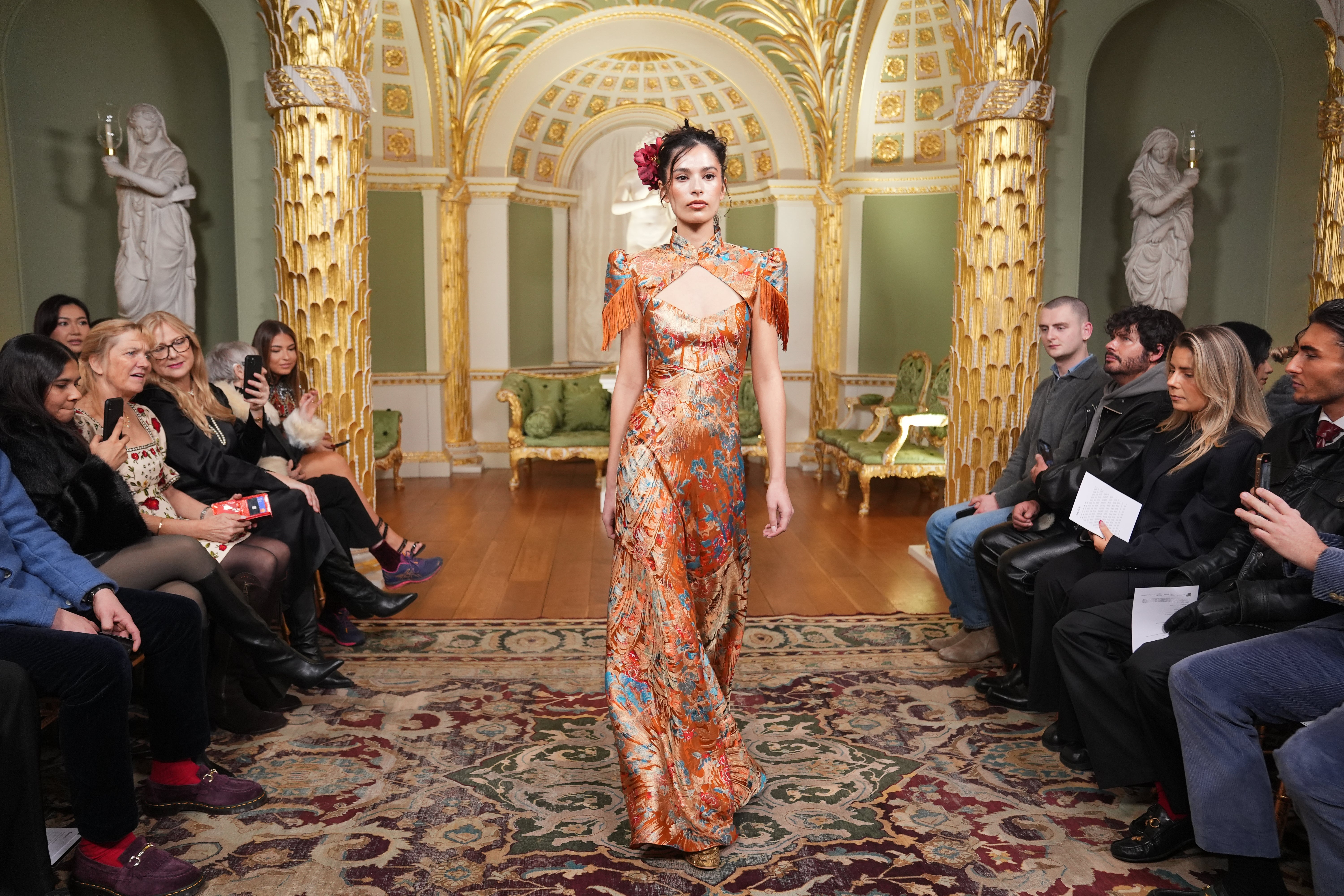 Texture played a central role. Tapestry-style florals in burnished orange, teal and gold were cut into high-necked dresses with sculpted shoulders, while metallic threads caught the light as the models turned.