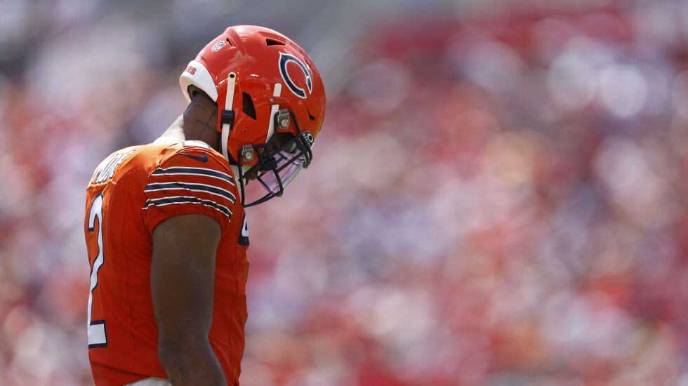 On the next six drives, the Bears totaled one field goal and averaged four yards per play. Fields and the offense finally clicked when, with about 10 minutes to play, they started a drive at their own 90 and scored eight plays later. Fields completed a deep ball over the middle to Moore for 22 yards on third-and-10 then found him down the left sideline for 12 more yards. He then zipped a 20-yard pass in the end zone to Chase Claypool, who was dogged all week by poor effort in the season opener. It was Moore’s first touchdown since the Bears traded for him in the middle of last season.