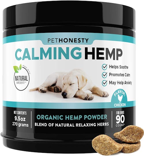 If your dog is stressed out — whether it be due to a vet visit or a bout of noisy fireworks — Michelle Lehr, therapy dog trainer and Head Writer at Good Dog Swag, suggests feeding them some chews made with hemp powder. How exactly do they work? “Hemp-based treats are high in essential fatty acids and antioxidants, which help support overall neuro health and are associated with calming, anti-stress effects,” she explains. Thanks to their appetizing chicken flavor, your pup won’t mind chowing down on them.