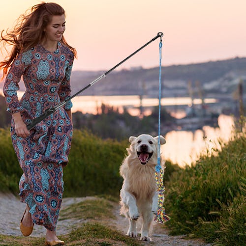 “If you are dealing with an anxious pup, then a good idea is to provide him with more exercise,” says Sharma. “This will keep him physically active and tired, so he won’t have time to feel anxious!” One of Sharma’s toy suggestions is a flirt pole — its long nylon cord provides a fast-moving, engaging distraction for your pooch. The sturdy stainless steel pole has a nonslip rubber handle on one end, so it’s easy to grasp, even as your dog grabs the rope toy at the end of the cord.