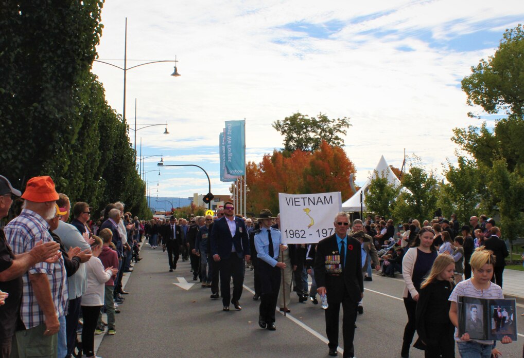 Anzac Day 2022 and High Street in Wodonga is lined with people — kids clutch flags as they peer over the crowd to the parade, a whole family stands by in Collingwood guernseys, elderly folk in wheelchairs applaud, teenagers take photos on their phones.