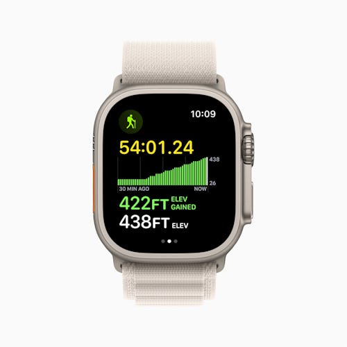 There’s a new customizable “action” button on the left side of the Apple Watch Ultra. Press it and you can go right into activity tracking.