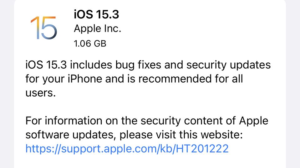It’s now available to download on compatible iPhones, with iPadOS 15.3 for suitable iPads. Compatibility for the phones reaches back as far as iPhone 6s, including iPhone SE first and current editions, plus the seventh-generation iPod touch. The complete list is: iPhone 13, iPhone 13 mini, iPhone 13 Pro, iPhone 13 Pro Max, iPhone 12, iPhone 12 mini, iPhone 12 Pro, iPhone 12 Pro Max, Phone 11, iPhone 11 Pro, iPhone 11 Pro Max, iPhone XS, iPhone XS Max, iPhone XR, iPhone X, iPhone 8, iPhone 8 Plus, iPhone 7, iPhone 7 Plus, iPhone 6s, iPhone 6s Plus, iPhone SE (second generation) iPhone SE (first generation) and iPod seventh generation.