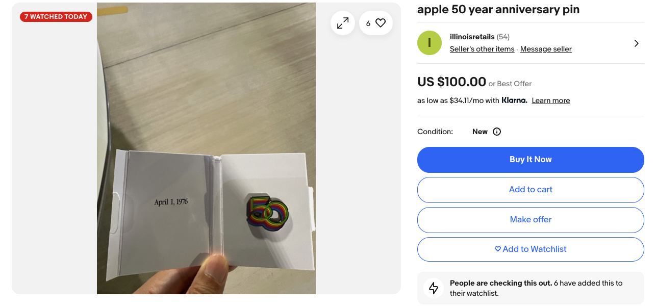 But what if it’s real? Would you pay $100 for a souvenir pin? Even a really cool one like this, complete with paperwork that indicates the date of Apple’s founding? Maybe. As of now, the pin has no bids but six watchers, who probably know better.