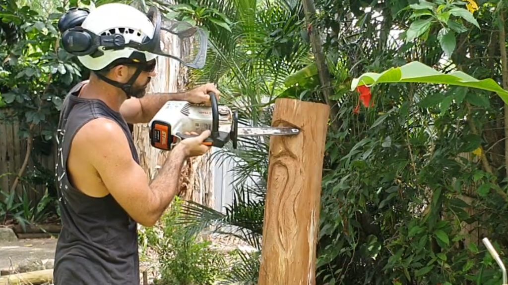 Michael uses a permanent marker to draw a rough outline for the eyes, nose and moustache and then uses the tip of the chainsaw to carve out all the facial features.