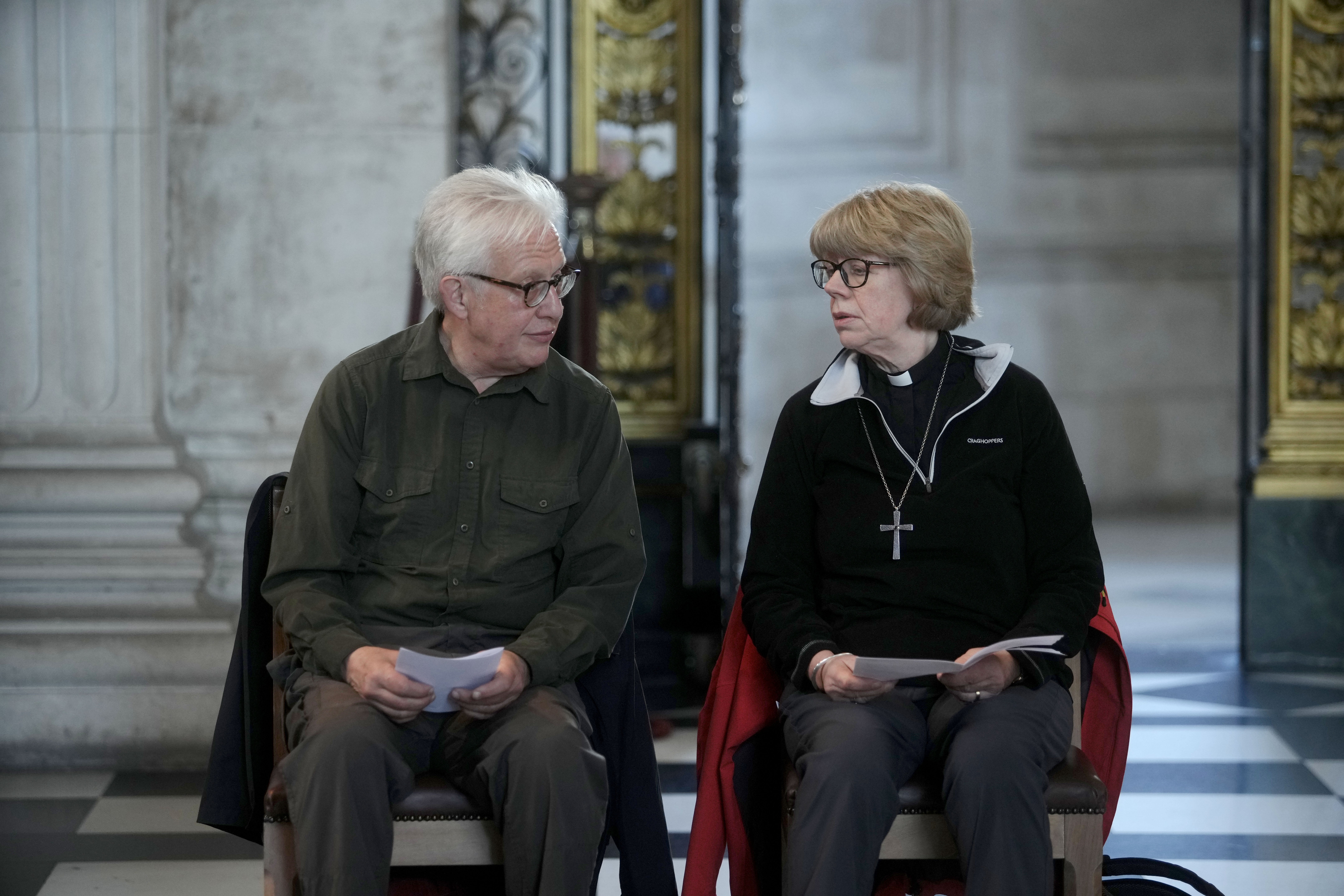 Alongside her husband Eamonn, she set off from St Paul’s Cathedral in London on Tuesday afternoon, enjoying mild weather and bright sunshine for the first steps of her journey to Canterbury Cathedral.